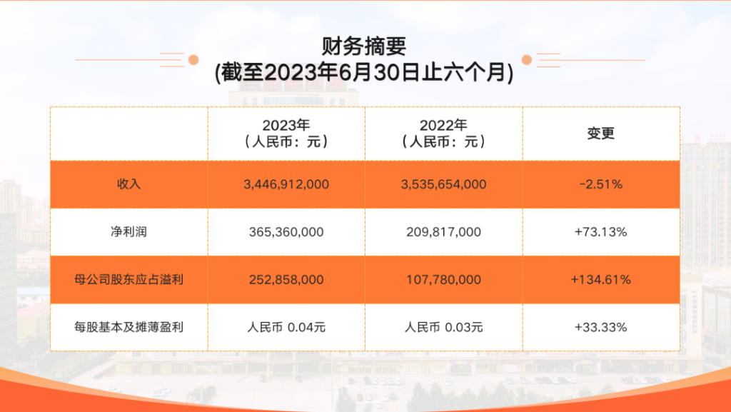 2023年上半年,面對嚴(yán)峻復(fù)雜的內(nèi)外部發(fā)展環(huán)境以及金價(jià)高位運(yùn)行的歷史機(jī)遇,招金礦業(yè)不斷提升風(fēng)險(xiǎn)預(yù)判能力,適時(shí)把握市場機(jī)遇,有效化解各種風(fēng)險(xiǎn)和挑戰(zhàn),取得了來之不易的發(fā)展成績。2023年上半年,招金礦業(yè)實(shí)現(xiàn)營業(yè)收入約人民幣34.47億元,較去年同期總體保持平穩(wěn);凈利潤增長約74.13%至約人民幣365,360,000元,母公司股東應(yīng)占溢利增長約134.61%至約人民幣252,858,000 元,母公司普通股股東應(yīng)占每股基本及攤薄盈利增長約33.33%至約人民幣0.04 元。