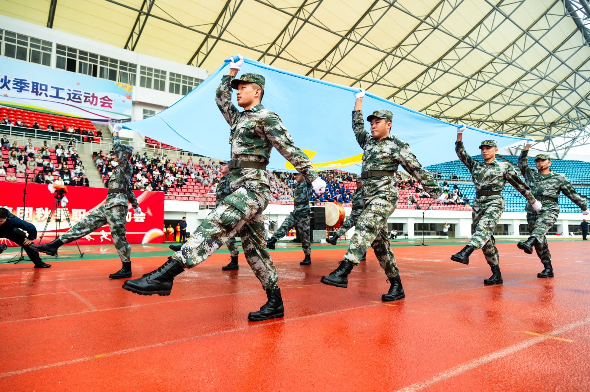 開幕式現(xiàn)場,伴隨著激昂的《運動員進行曲》,各方隊步伐鏗鏘,口號嘹亮,氣勢如虹,昂首闊步依次入場。