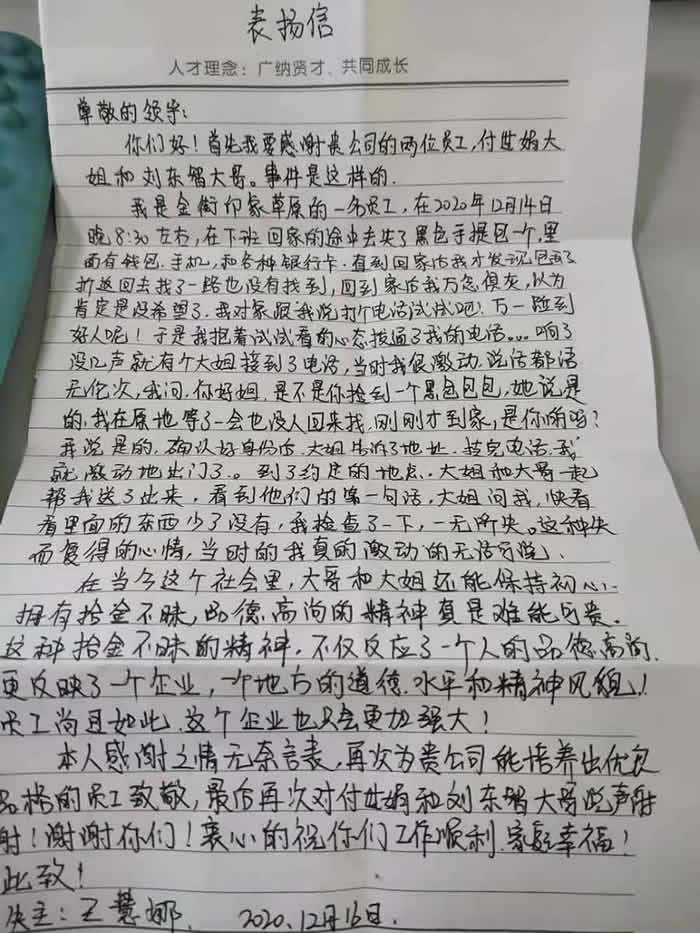 “招金有這樣的員工真是好樣的,真是太感謝你們了!”12月16日上午,拖著疲憊身軀但充滿興奮神情的王女士帶著感謝信來到山東招金金銀精煉有限公司,向我們道出了一段不為人知的招金好人好事。