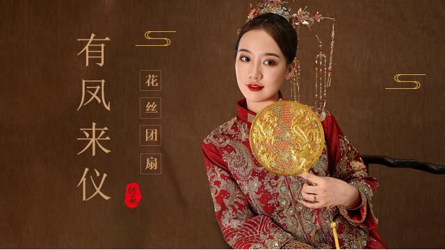 采金為絲,妙手編結(jié)。有鳳來儀花絲團扇以金絲為材質(zhì),采用傳承百年的宮廷技藝--花絲鑲嵌工藝精制而成?;ńz鑲嵌工藝于2008年被列入國家非物質(zhì)文化遺產(chǎn)名錄,技藝繁復(fù)細膩,成品華麗精美。有鳳來儀花絲團扇以圓形為輪廓,寓意著團圓和美,喜結(jié)善緣,好事圓滿。一根根花絲掐成云頭紋樣式,堆壘攢焊在一起,配以鳳凰、牡丹做裝飾,完美的詮釋了國色天香、雍容華貴的氣質(zhì)。