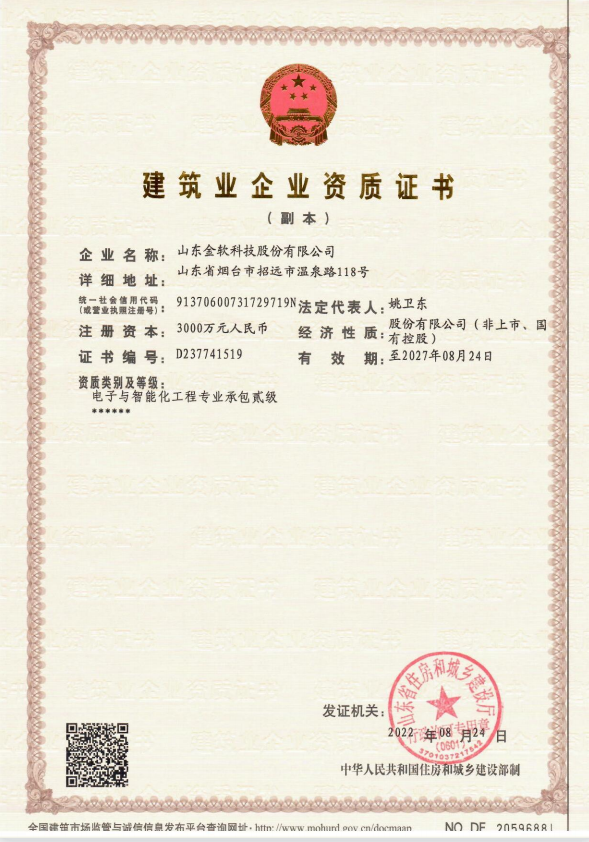 金軟科技獲“電子與智能化施工貳級(jí)”資質(zhì)