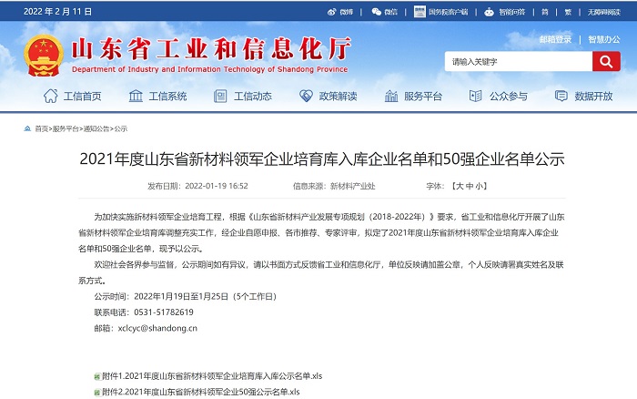 近日,山東省工業(yè)和信息化廳下發(fā)了《關(guān)于公布2021年度山東省新材料領(lǐng)軍企業(yè)培育庫入庫名單和50強名單的通知