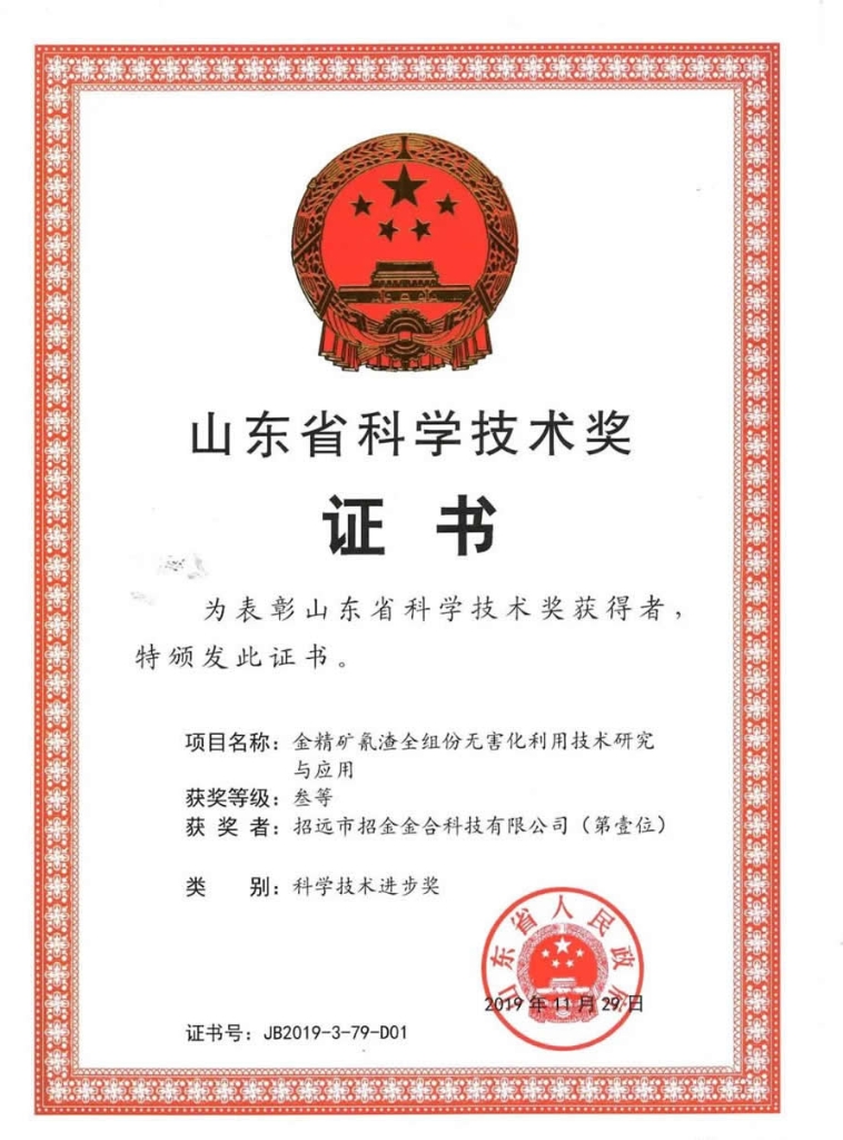 日前,山東省政府公布了2019年度科學(xué)技術(shù)獎表彰名單,由招遠(yuǎn)市招金金合科技有限公司自主研發(fā)的“金精礦氰渣