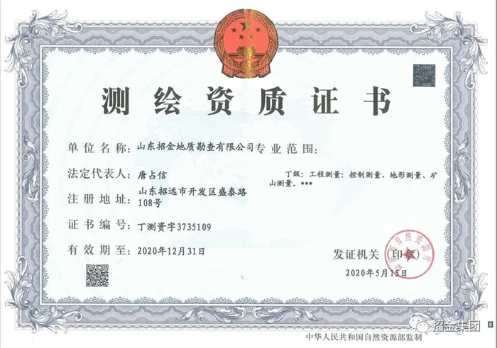 招金地勘獲得丁級地質(zhì)測量資質(zhì)證書