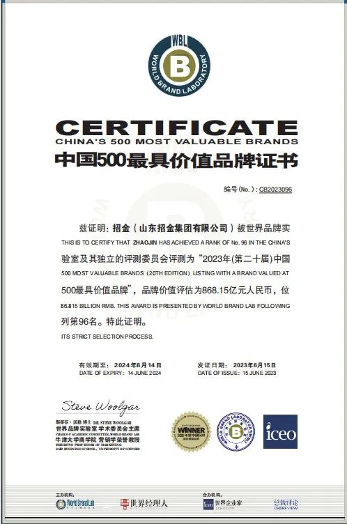 6月15日,由世界品牌實驗室(World Brand Lab)主辦的第二十屆“世界品牌大會”在北京舉行。大會基于財務(wù)數(shù)據(jù)、品牌強度和消費者行為分析發(fā)布了2023年《中國500最具價值品牌》分析報告,招金集團以868.15億元品牌價值入選2023年中國500最具價值品牌,排名第96位,位列山東省第7位,煙臺市第1位。